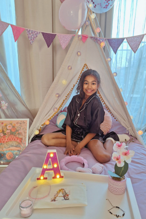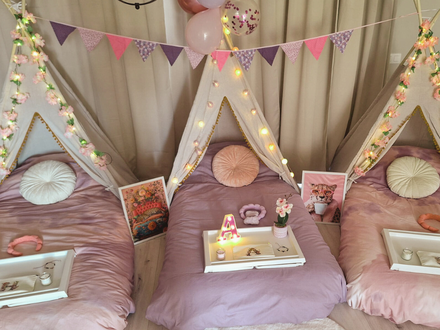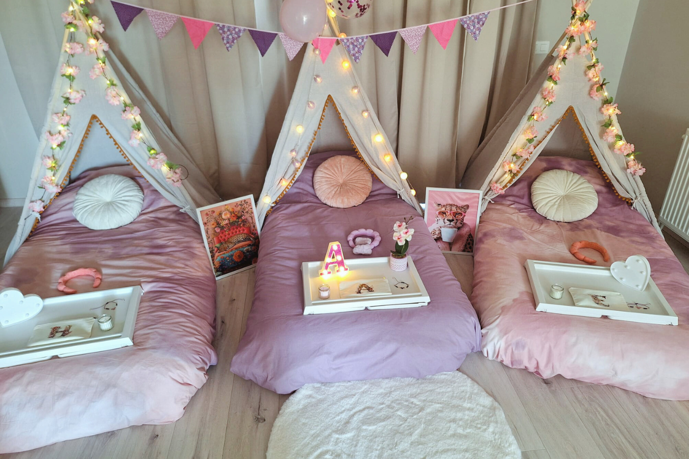 Bij mij geen groot, onpersoonlijk verhuurbedrijf – ik werk kleinschalig en met veel liefde aan elk feestje. Elk detail is met zorg uitgekozen om een warme en betoverende sfeer te creëren. Ik help je graag om van het slaapfeestje een droomfeest te maken